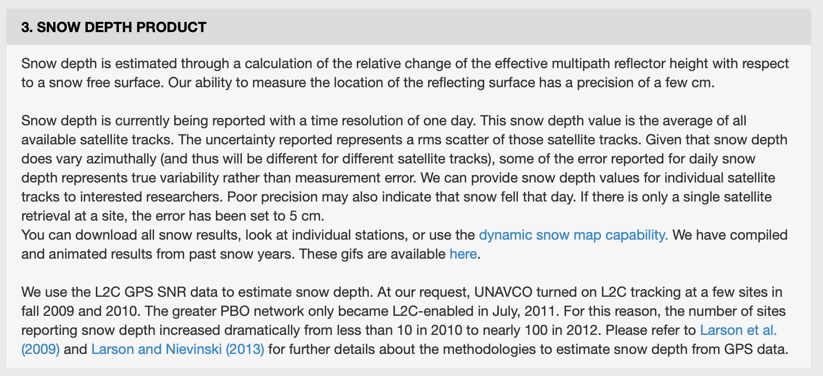 GPS Interferometric Reflectometry (GPS-IR) is a new method to measure snow depth. It has a footprint of ~1000 square meters. It was developed at the University of Colorado with our research partners at UCAR and NOAA. Our PBO H2O project routinely measured snow depth for 220 sites in North America. Any geodetic quality GPS site can be used to measure snow depth if the site is surrounded by natural, planar surfaces. Results are archived at the NSIDC and at CIRES.